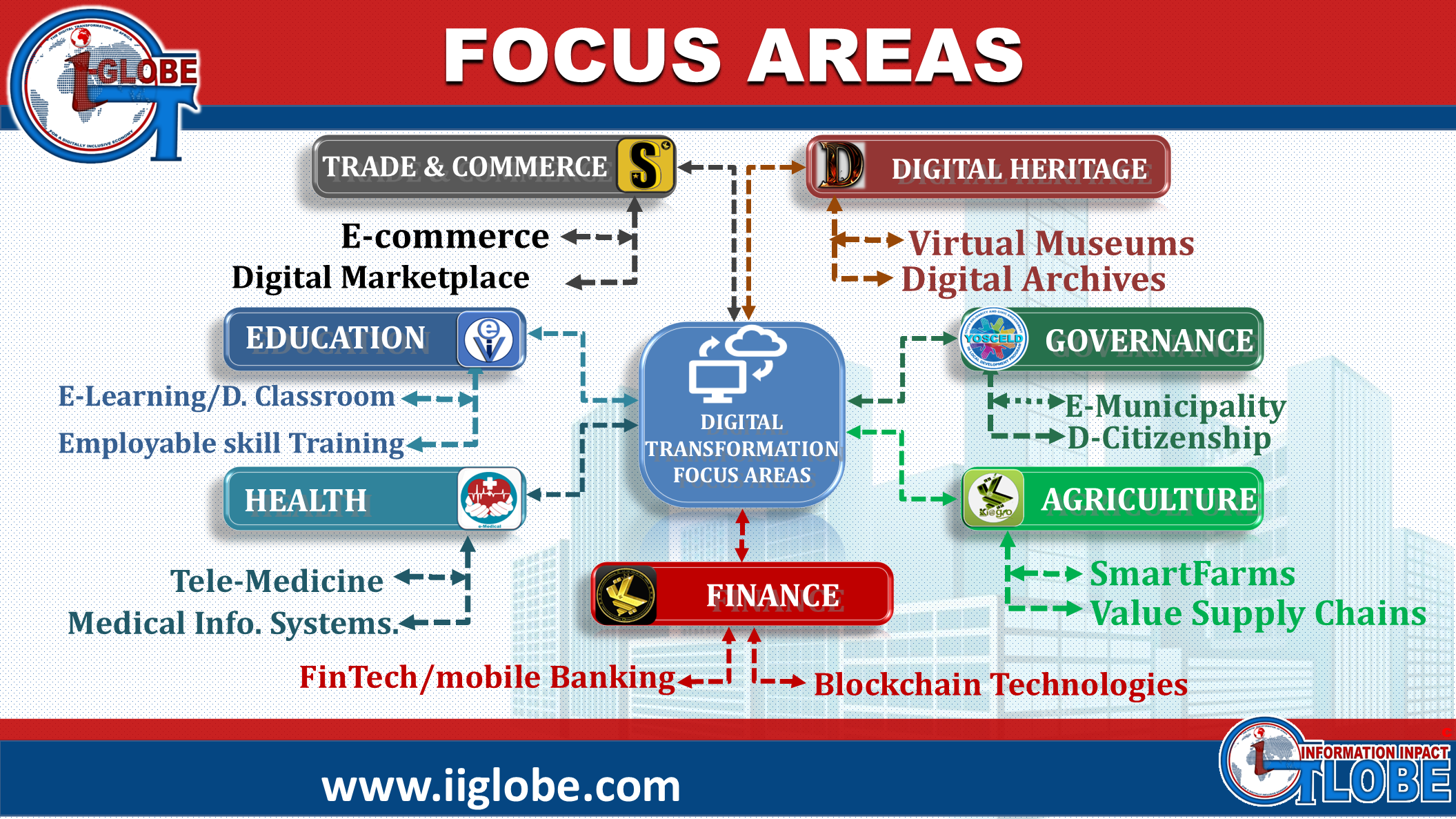 However our work is built on a commitment to transform information into impact. We strategically focus our efforts on key sectors to drive digital transformation and foster an inclusive digital economy. Our core focus areas are:
